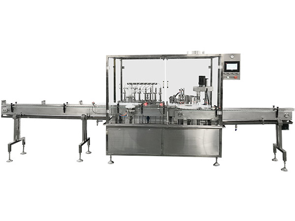 该设备是集灌装旋盖于一体,主要用于玻璃瓶或塑料瓶的灌装、上盖、封口。为双轨灌装,双轨进瓶,双旋头旋盖的直线间歇方式工作,结构紧凑,符合GMP要求。